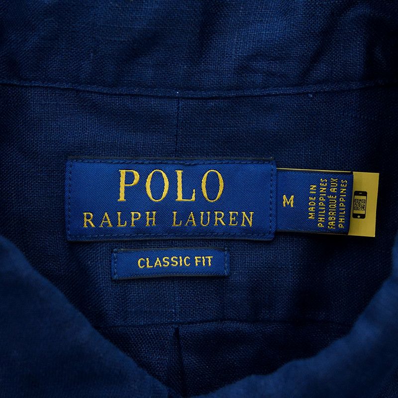 ポロラルフローレン|POLO RALPH LAUREN CLASSIC FIT ロゴ 刺繍 リネン 半袖 ボタンダウン シャツ ネイビー サイズ メンズM