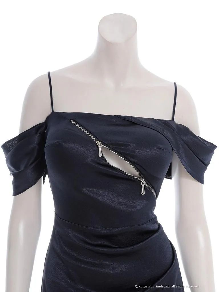 ネイビーS OF 05 ON 2984-BE-2509 ANDY|アンディ フロントジップ| ストレッチサテン| オフショル| キャミソール| シンプル| ワンカラー| アシンメトリー| フリル| フ | ミディアムドレス| キャバドレス