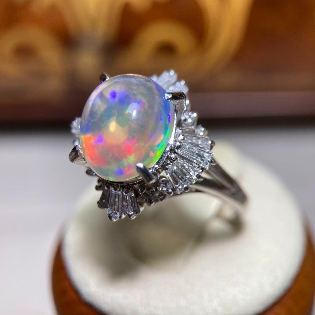 pt 900 陽刻 天然メキシコ産 ウォーターオパール 4.75 ct ダイヤモンド 1.03 ヴィンテージリング 指輪