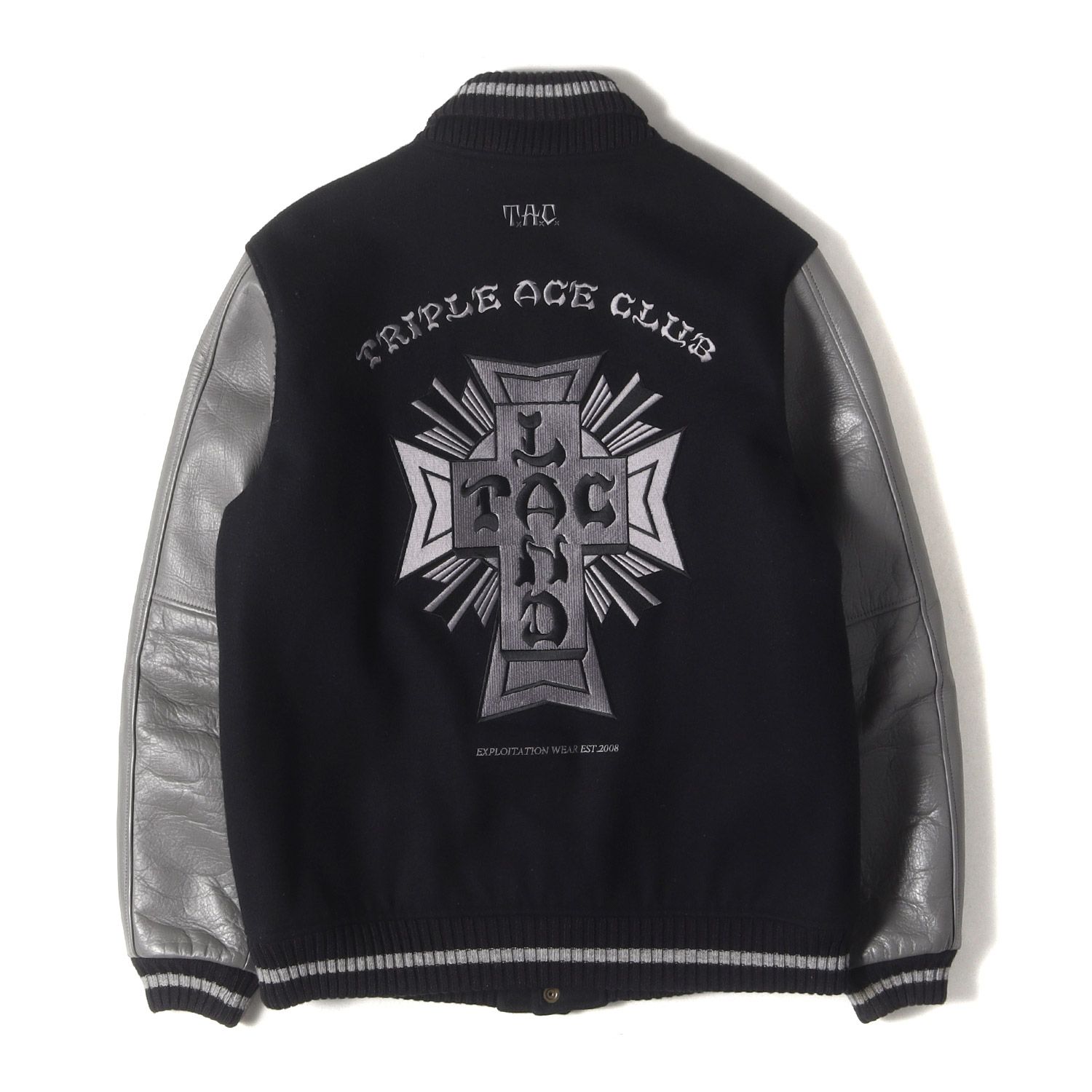 TRIPLE ACE CLUB トリプルエースクラブ ジャケット ブラック×グレー サイズ M | クロスロゴ 袖レザー メルトン スタジャン アウター ブルゾン ジャンパー 上着 メンズ