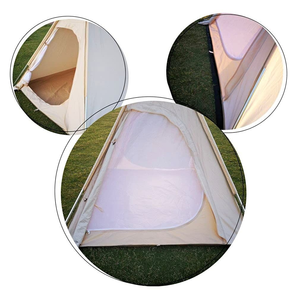 【両開き扉設計】:メンテナンスが容易な両開き扉。 両方のキャンバスフラップドアには、通気性を向上させるメッシュスクリーンが装備されています。 テントの上部には、空気を循環させて換気を維持するための4つの換気穴があります。