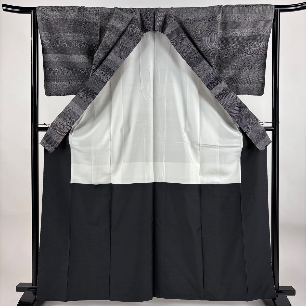 江戸小紋 身丈164 cm 裄丈65.5 M 袷 結城紬 落款 証紙 段縞 寄せ柄 黒 正絹