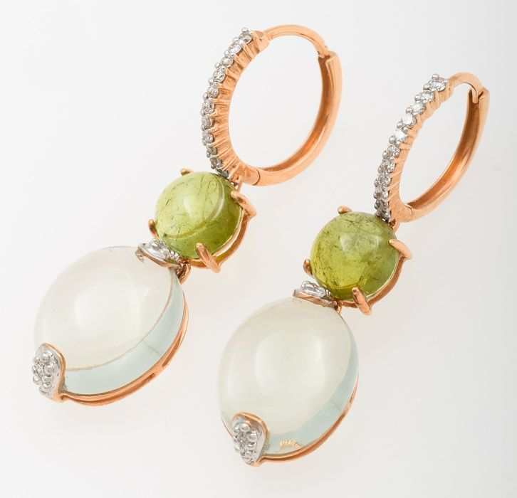 #説明 : #ピンクゴールド (18金)の枠にダイヤモンドと#グリーントルマリン ・#グリーンクォーツ がセットされた#マルチ ピアスです。